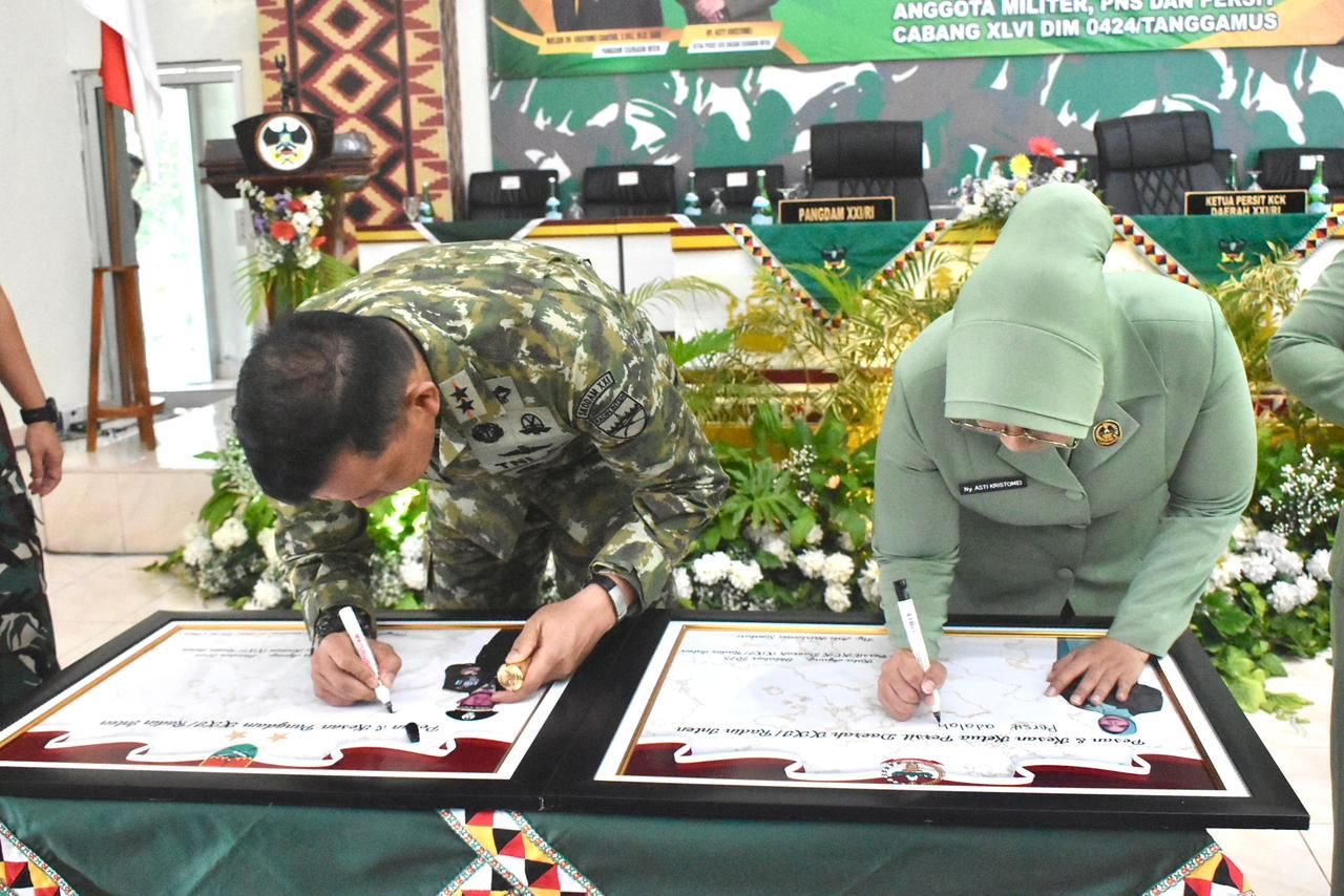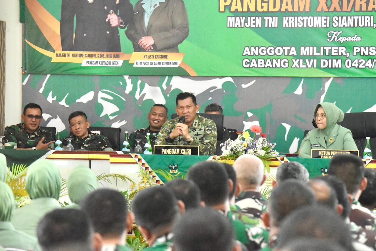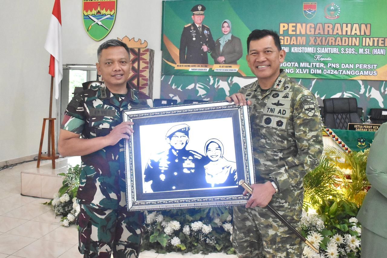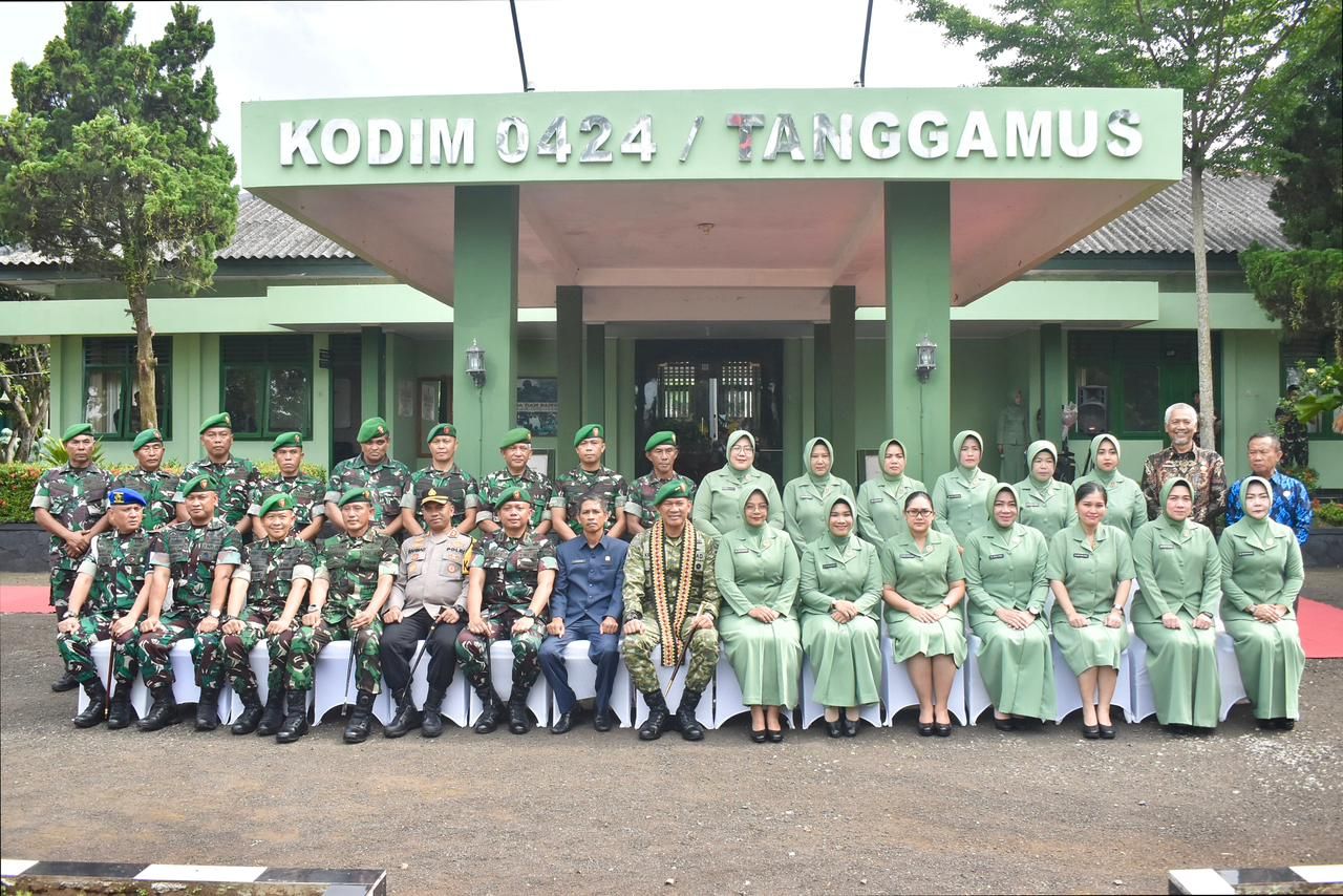 Pangdam XXI/Radin Inten Mayjen TNI Kristomei Sianturi, S.Sos., M.Si. (Han), didampingi Ketua Persit Kartika Chandra Kirana Daerah XXI/Radin Inten, Ny. Asti Kristomei Sianturi, melaksanakan kunjungan kerja ke Kodim 0424/Tanggamus, Kamis (16/10/2025).